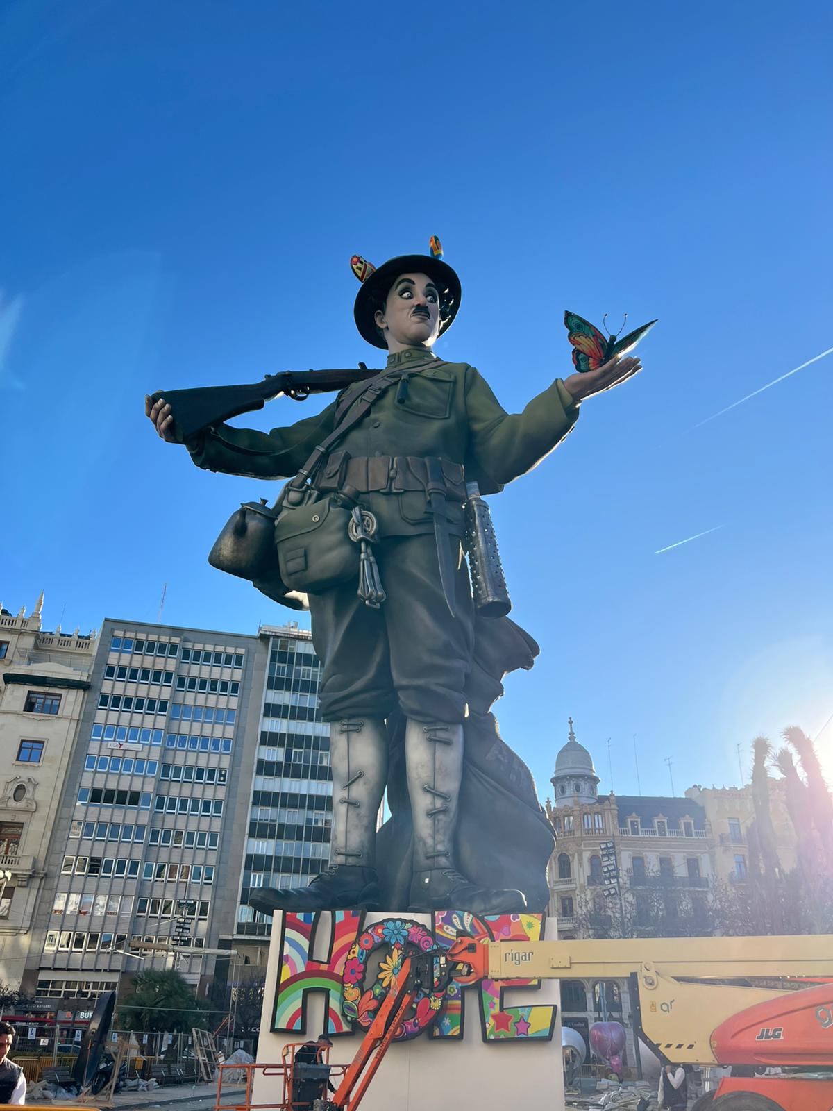 Un Charles Chaplin de 27 metros vigila toda la plaza