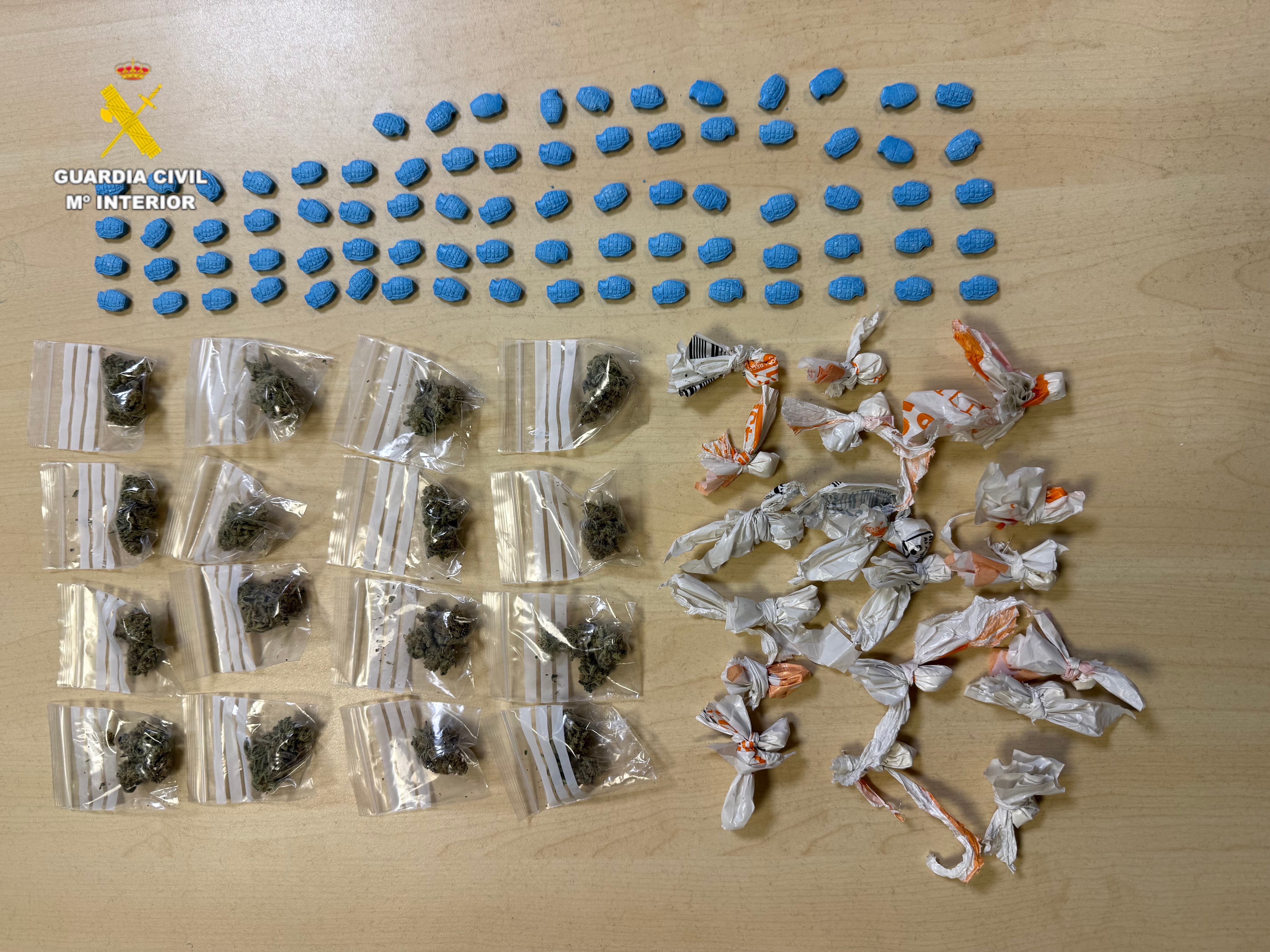 Tras la intervención, se comprobó que el objeto arrojado era una bolsa de grandes dimensiones que contenía lo que parecían diversas sustancias estupefacientes distribuidas en dosis individuales listas para su venta. En concreto, se intervinieron 18 envoltorios con metanfetamina (27,6 gramos), 16 bolsitas con marihuana (19,03 gramos) y 79 pastillas de MDMA.
