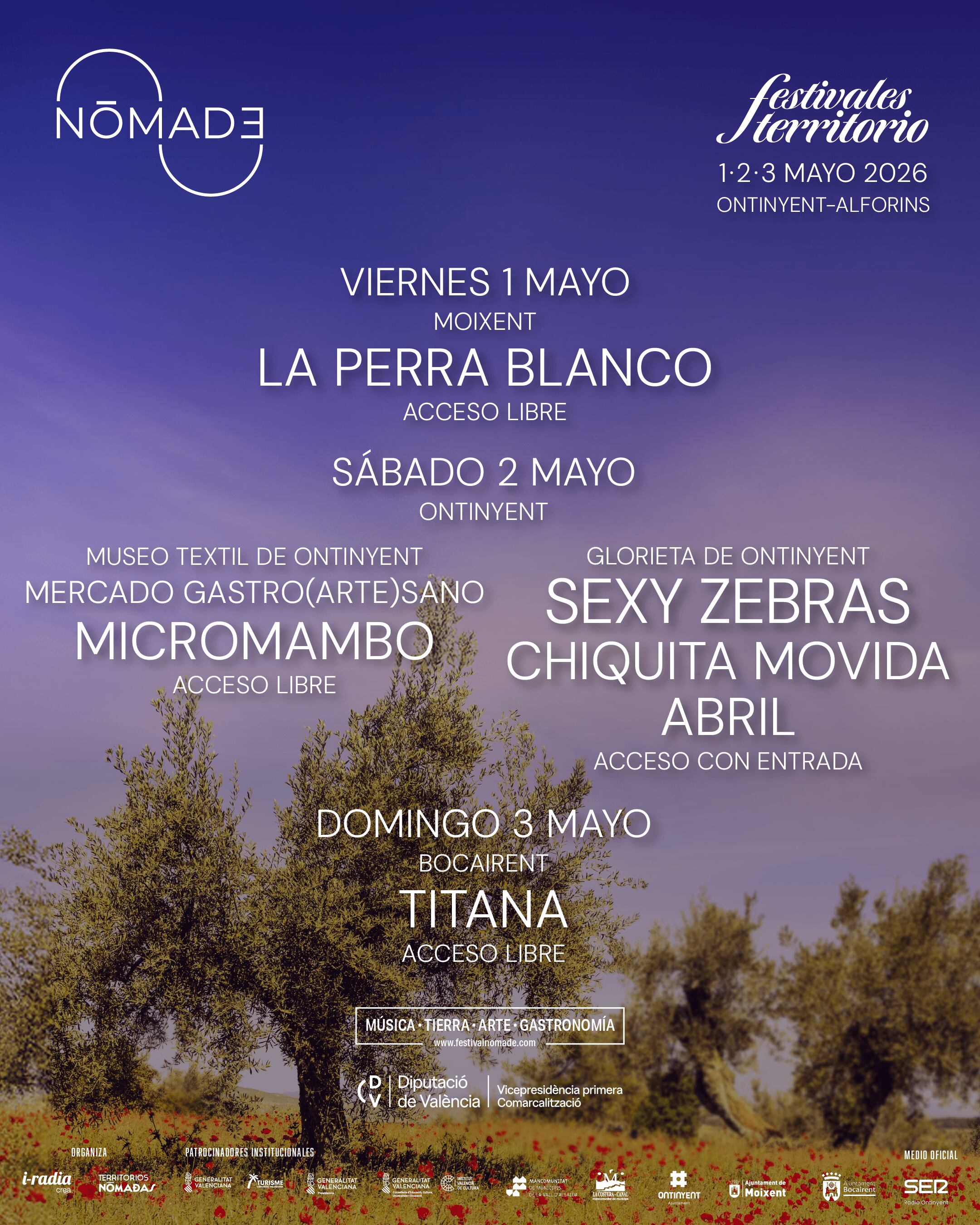 La música seguirá siendo uno de los pilares del festival, con conciertos distribuidos en diferentes espacios del territorio. La jornada central del sábado 2 de mayo en La Glorieta de Ontinyent contará con actuaciones destacadas como Sexy Zebras, Rayden junto a su nueva banda Chiquita Movida, y Abril.