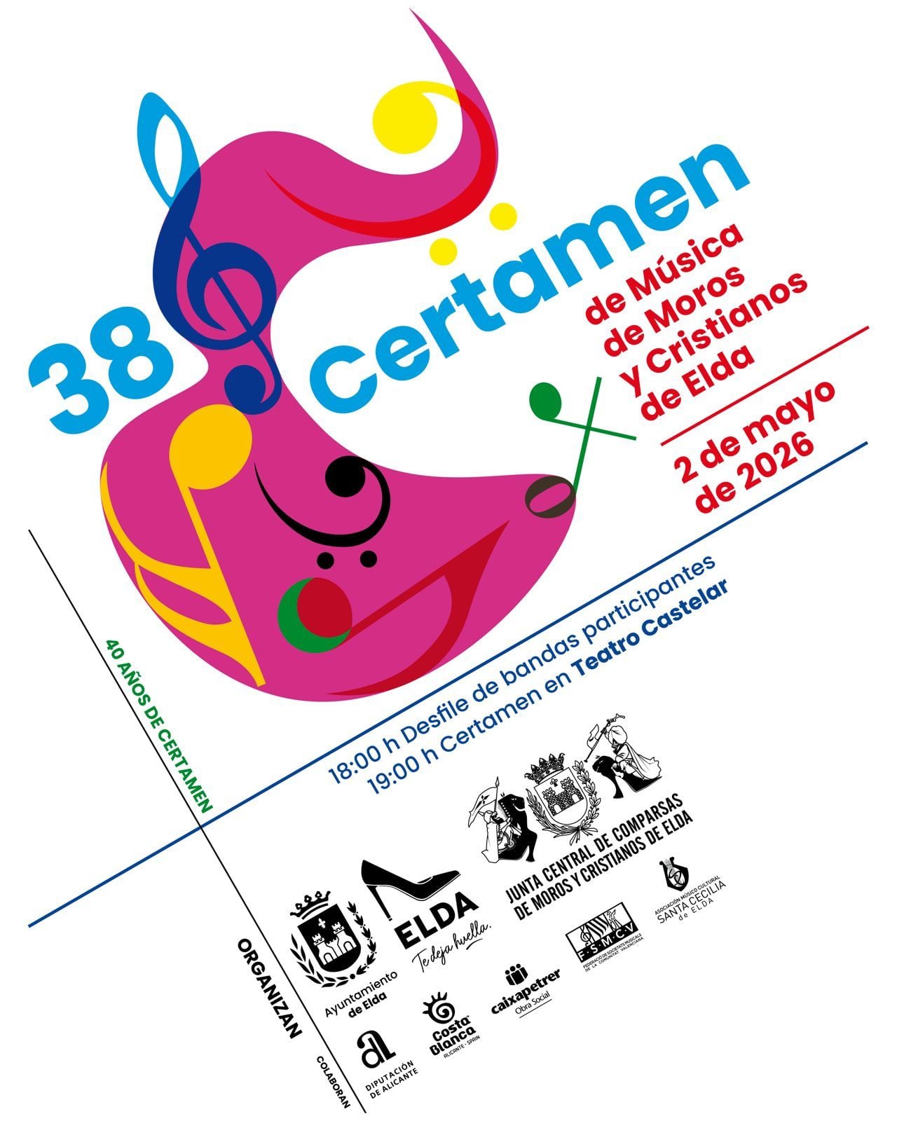 El Certamen de Música de Moros y Cristianos celebra este próximo sábado, 2 de mayo de 2026, su 38ª edición en el Teatro Castelar de Elda, recuperando su carácter competitivo y consolidándose como una de las citas musicales más destacadas dentro del ámbito festero.