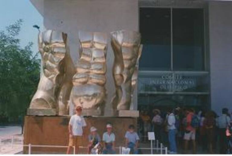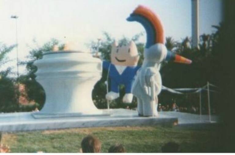 Curro y Cobi, junto al pebetero del Pabellón Olímpico.