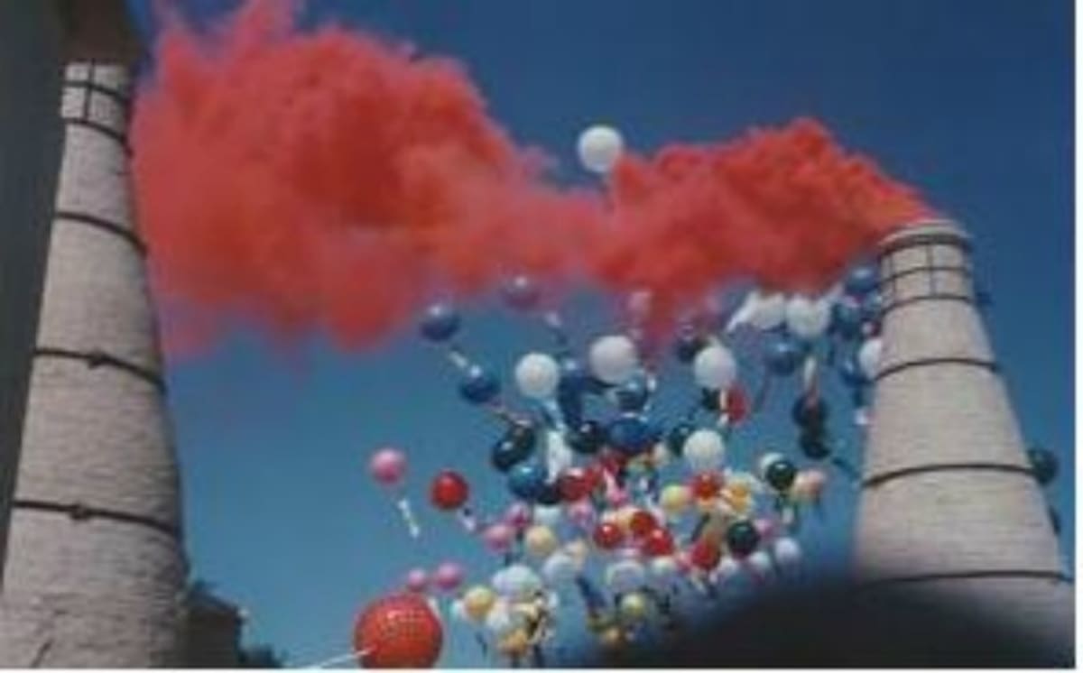 Las chimeneas del Pabellón de España echando humo de color rojo.