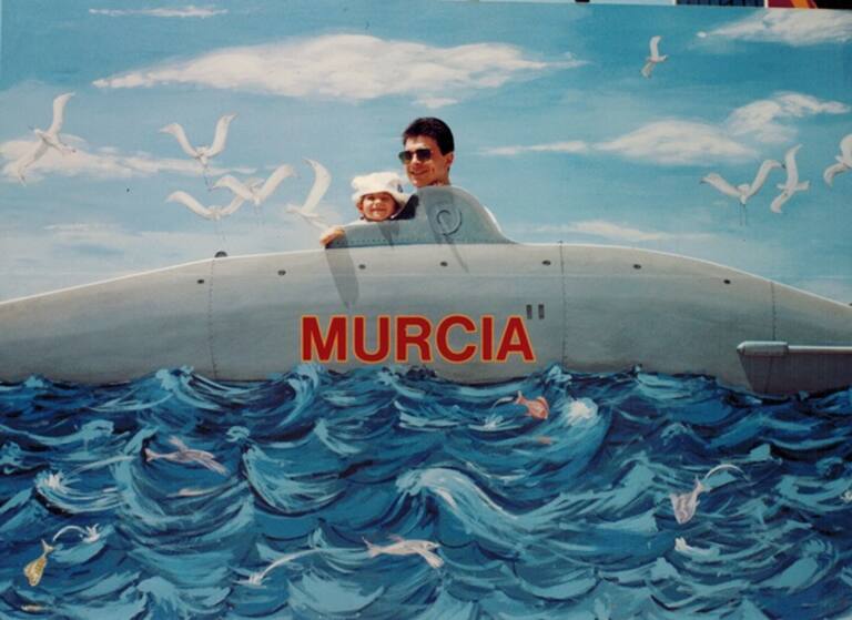El amigo Miguel Ángel Leal con su hija Macarena en el submarino del pabellón de Murcia emulando a Federico García Lorca.