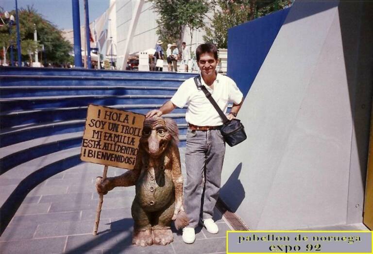 Miguel Francisco Pérez, junto a un troll del pabellón de Noruega.