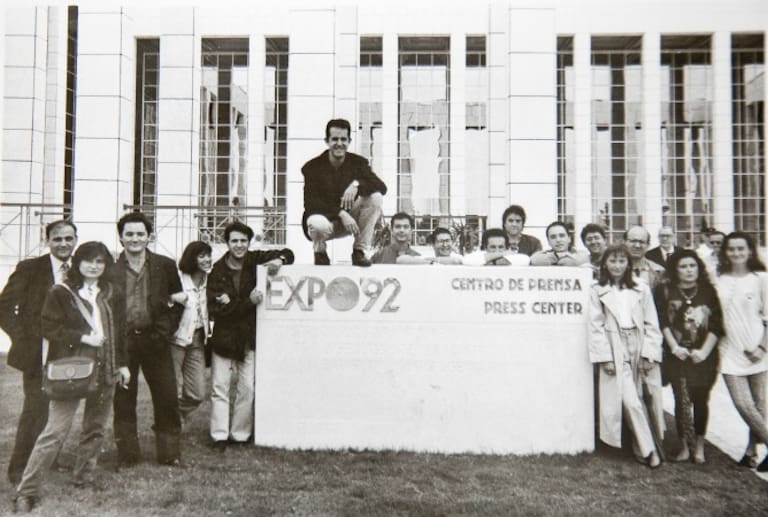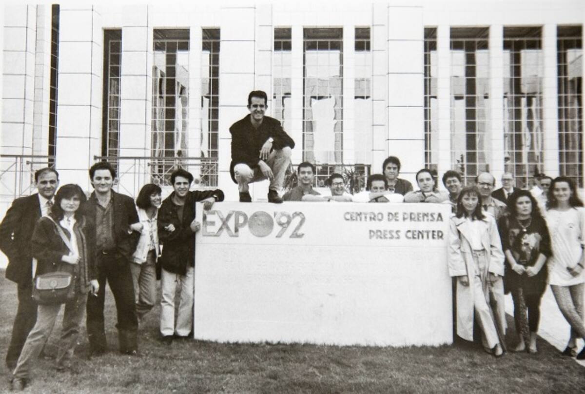 Los compañeros de El Correo de Andalucía ante el Centro de Prensa de la Expo.
