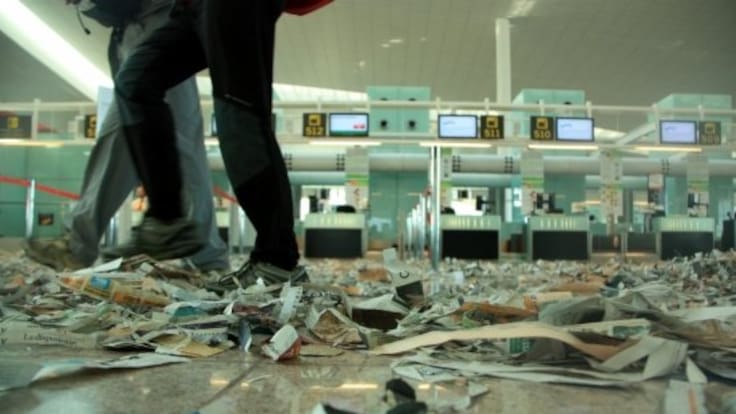 Movilizaciones entre los trabajadores de limpieza del aeropuerto del Prat. Esta mañana han ensuciado con papeles las instalaciones de la T1 para protestar por los recortes de sus condiciones laborales. Según los sindicatos convocantes, el seguimiento del paro en el sector de limpieza del Prat está siendo del 100 por cien y el paro se prolongará hasta mañana. Los pasajeros, tanto los que partían como los que llegaban, se han visto sorprendidos por una alud de basura en la terminal. / ATLAS