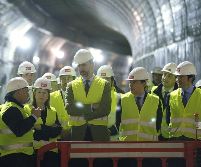 El Príncipe de Asturias ha bajado hoy a los túneles del Metro de Madrid para inaugurar el final de los trabajos de excavación que permitirán ampliar, con 63 millones de euros, la línea 9 desde Mirasierra hasta una nueva estación, al sur de Montecarmelo, que atenderá en 2015 a unos 50.000 usuarios. Acompañado por la ministra de Fomento, Ana Pastor, y el presidente regional madrileño, Ignacio González, Don Felipe ha recorrido a pie, con casco y chaleco reflectante, los 800 metros que separan el acceso en obras al nuevo túnel y los andenes de la estación de Mirasierra, actual cabecera de línea, donde los pasajeros contemplaban con curiosidad a la nutrida comitiva.