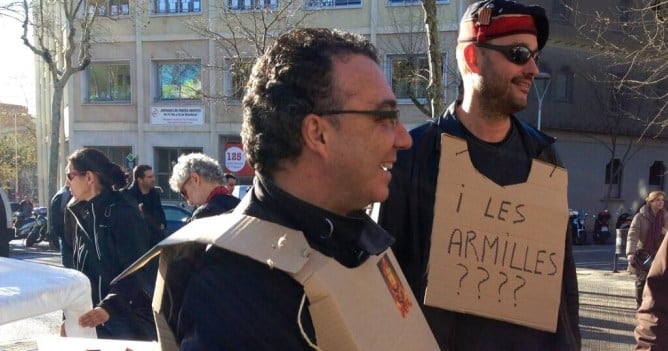 Els agents fan aquesta protesta per rebutjar la política de retallades del Departament. Porten armilles de cartró amb el lema "Mossos en lluita" per denunciar la manca de material que pateixen.