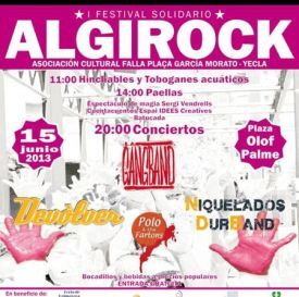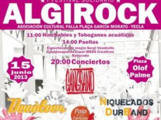 El sábado tenemos día intenso : Primer Festival Solidario Algirock , organizado por la Asociación Cultural Falla Plaça García Morato-Yecla. Un cartel intenso desde la mañana con actividades para los niños y con actuaciones musicales que no pasarán desapercibidas como las de Devolver, divertidos y desenfadados.