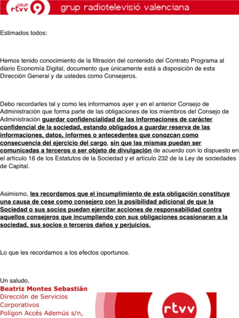 La Ser ha tenido acceso a la carta que han recibido los consejeros en la que la dirección insinúa que han filtrado el contenido del contrato programa y les recuerda que esas filtraciones pueden ser "objeto de cese". Fuentes de RTVV aseguran que simplemente se exige confidencialidad
