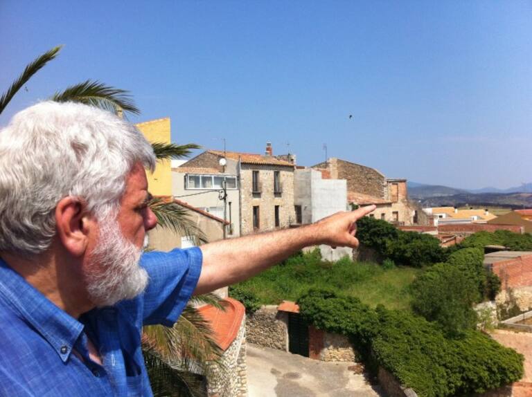 Josep Ministral, pintor altempordanès. Assenyala el punt on el foc es va aturar a l'entrada del poble