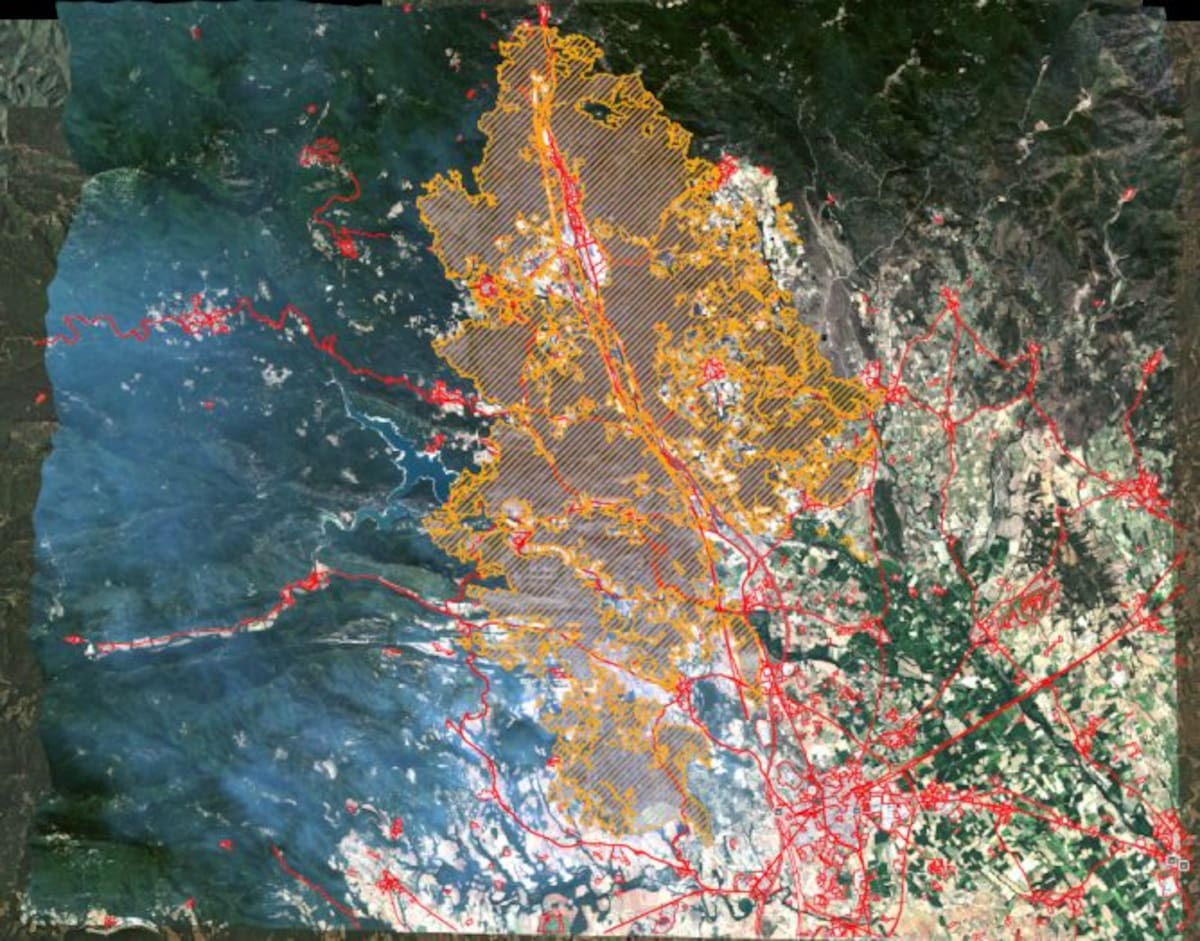 Mapa d'alta precisió fet per un satèl.lit militar que els bombers van utilitzar aquells dies per perfilar el foc i moure's per la comarca. Document inèdit