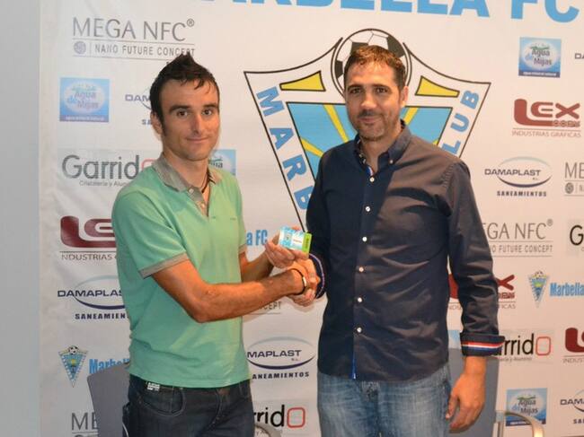 Luis Ángel Maté recibe el carné del Marbella de manos del entrenador Jaime Molina.(CADENA SER)