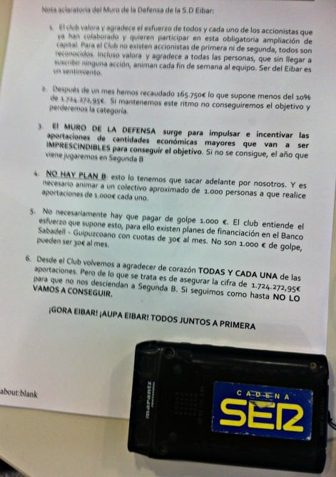 Tras la presentación del Muro de la Defensa, la última iniciativa de la campaña de ampliación de capital del Eibar para evitar su descenso administrativo a Segunda B, sugió una fuerte polémica acusando al club de crear accionistas de Primera y de Segunda con ese muro. La entidad armera reaccionó rápido con un comunicado que reproducimos bajo estas líneas, y después la Cadena SER en Gipuzkoa habló con el presidente del Eibar, Alex Aranzabal, que explicó con vehemencia y rotundidad la situación complicada por la que pasa la ampliación de capital.