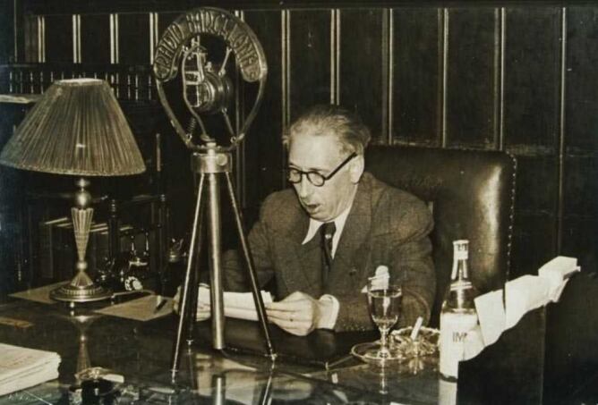 El President Lluís Companys davant del micròfon de Ràdio Barcelona, al seu despatx del Palau de la Generalitat