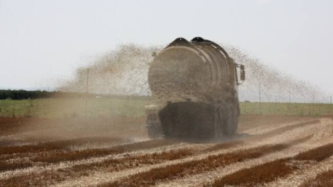 Un camió cisterna aplicant purins en un camp de cereal d'Alcarràs ja recol·lectat(Un camió cisterna aplicant purins en un camp de cereal d'Alcarràs ja recol·lectat -foto:ACN-)