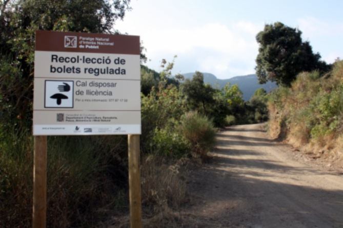 (Cartells que avisen de la regulació a Poblet, on cal carnet per collir bolets des de 2012. Foto: ACN.)