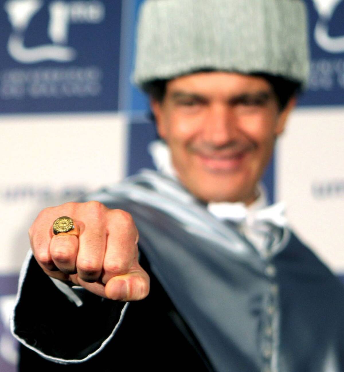 El actor y director de cine Antonio Banderas muestra el anillo recibido tras su investidura como doctor Honoris Causa en la facultad de Telecomunicaciones de la Universidad de Málaga.