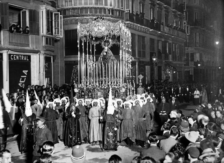 Las diferentes hermandades recorren las calles de la ciudad con sus imágenes, durante la Semana Santa malagueña de 1925.