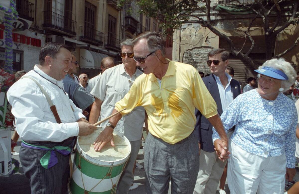 El expresidente de los Estados Unidos, George Bush acompañado de su esposa Bárbara, toca un tambor rociero que le ofrece un hombre vestido de campero, durante su recorrido por las calles de Málaga en el primer día de Feria de 1993.