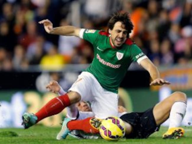 Beñat Etxebarria y el centrocampista del Valencia Javi Fuego durante el partido correspondiente a la undécima jornada de Liga de Primera División que disputan en el estadio Mestalla de Valencia. / Juan Carlos Cardenas