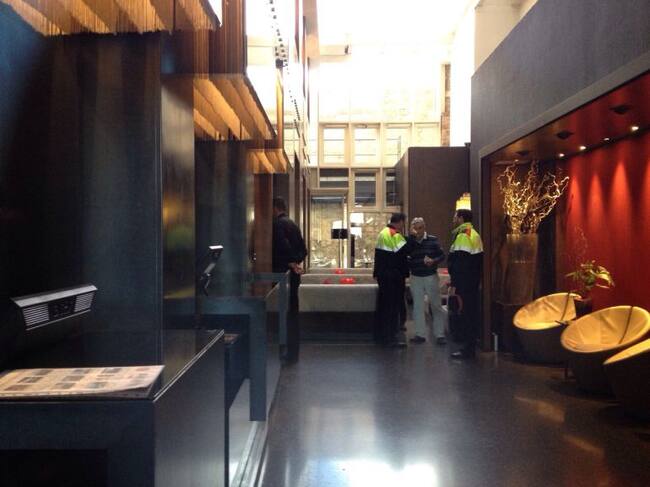 Els mossos parlant amb responsables de l’Hotel Olivia Plaza de Barcelona diumenge després de l’aparició del cadàver de la noia