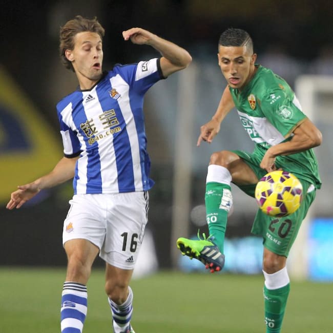 GRA463. SAN SEBASTIÁN, 28/11/2014.- El jugador francés del Elche Faycal Fajr (d) juega un balón ante Sergio Canales, de la Real Sociedad, durante el partido de Liga en Primera División disputado esta noche en el estadio de Anoeta, en San Sebastián. EFE/Juan Herrero. / Juan Herrero (EFE)