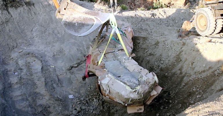 La operación para extraer y trasladar la 'momia', nombre que los paleontólogos han dado al bloque formado por el fósil, la roca que lo rodea así como estructuras metálicas y espuma de poliuretano que protege el fósil, duró casi 5 horas y requirió el uso de una potente retroexcavadora.
