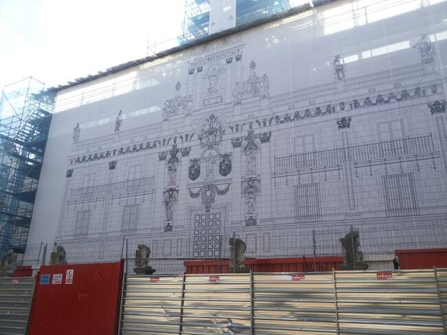 Uno de los andamios que cubre la fachada del edificio facilitará que puedan conocer de cerca los trabajos que se realizan en el edificio. Son visitas programas por lo que los interesados en poder acceder tienen que llamar y trasladar la petición a la Unidad Técnica de Arquitectura.
