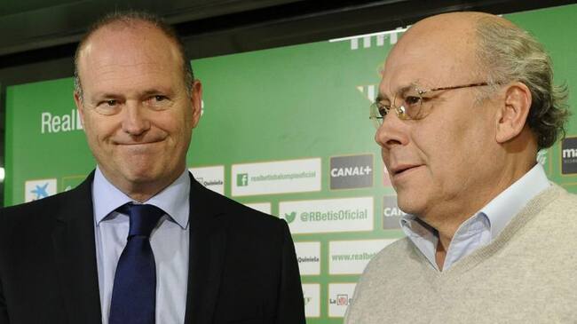 GRA141. SEVILLA, 22/12/2014.- El presidente del Real Betis Balompié, Juan Carlos Ollero (d), durante la presentación hoy del nuevo entrenador del equipo bético, Pepe Mel (i), que vuelve al club 385 días después de su destitución, período en el que han pasado por el banquillo cuatro técnicos. EFE/ Raúl Caro. / Raúl Caro (EFE)