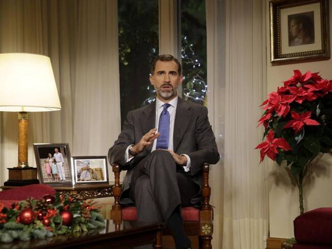 *EMBARGADA HASTA LAS 21:00H* GRA099. MADRID, 24/12/2014.- El rey Felipe VI comparece ante los españoles desde el Palacio de La Zarzuela con el pimer mensaje televisado de Navidad de su reinado, en el que traslada a los ciudadanos sus compromisos y preocupaciones ante el nuevo año. EFE/Ángel Díaz ***POOL*** / Angel Díaz (EFE)