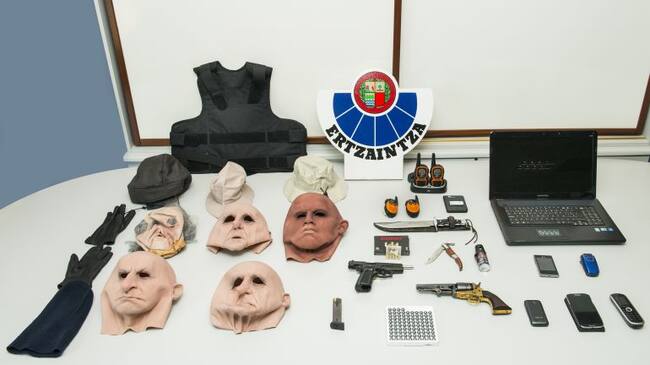 Con los arrestos la Policía Vasca se ha incautado de diferentes objetos relacionados con los atracos: dos armas cortas, un chaleco antibalas, cinco máscaras de látex y guantes de nitrilo, dos equipos de comunicaciones compuestos por dos transmisores- receptores, seis teléfonos móviles, diferentes prendas y complementos utilizados en los atracos, un turismo, y 11.000 euros en metálico.
