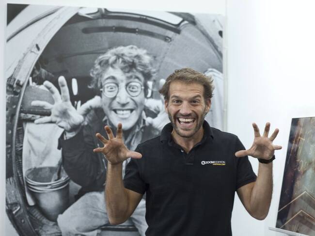 Uno de los propietarios de la tienda Zoomedition posa delante de una foto de César Lucas a John Lennon