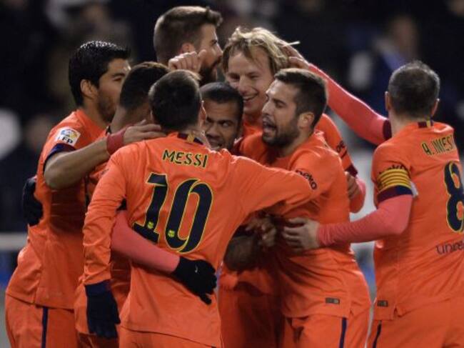 Barcelona's Argentinian forward Lionel Messi celebrates a goal with teammates during the Spanish league football match RC Deportivo de la Coruna vs FC Barcelona at the Municipal de Riazor stadium in La Coruna on January 18, 2015. Messi made it a hat-trick and Barcelona won 4-0. AFP PHOTO/ MIGUEL RIOPA / MIGUEL RIOPA