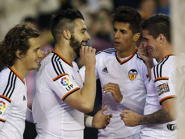 GRA247. VALENCIA, 17/01/2015.- El delantero del Valencia Álvaro Negredo (2i) celebra con sus compañeros el gol marcado al Almería, tercero para el equipo, durante el partido de la decimonovena jornada de Liga disputado esta tarde en el estadio de Mestalla. EFE/Kai Försterling / Kai Försterling (EFE)