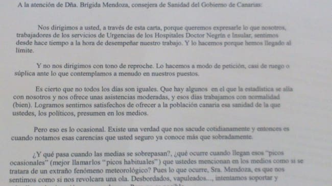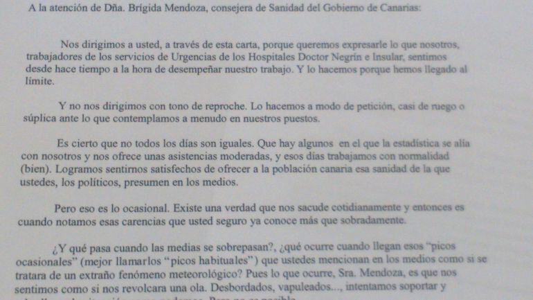 Un ruego para parar el deterioro de los servicios de urgencias de los hospitales grancanarios, el Doctor Negrín y el Insular. Éso es lo que le han pedido 218 profesionales de este área a la consejera de Sanidad, que a través de una misiva, han querido dirigirse públicamente a Brígida Mendoza para decirle que no pueden más, que la saturación no es algo puntual y que, a pesar de lo que diga públicamente, las plantillas no se están reforzando.