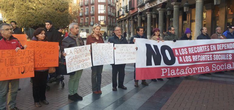 La Plaza de Fuente Dorada ha sido escenario de una concentración que protesta por la drástica y grave reducción de las ayudas destinadas a personas dependientes. Medio centenar de personas salen a la calle, y a golpe de pancarta, ponen de manifiesto las devastadoras consecuencias que han tenido las modificaciones en la ley de dependencia.