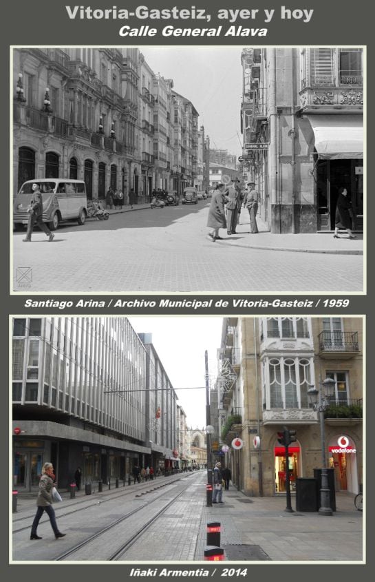 La fotografía de Santiago Arina del Archivo Municipal de Vitoria, obtenida en 1958, nos muestra la calle General Alava en el tramo entre las calles San Antonio y Dato.