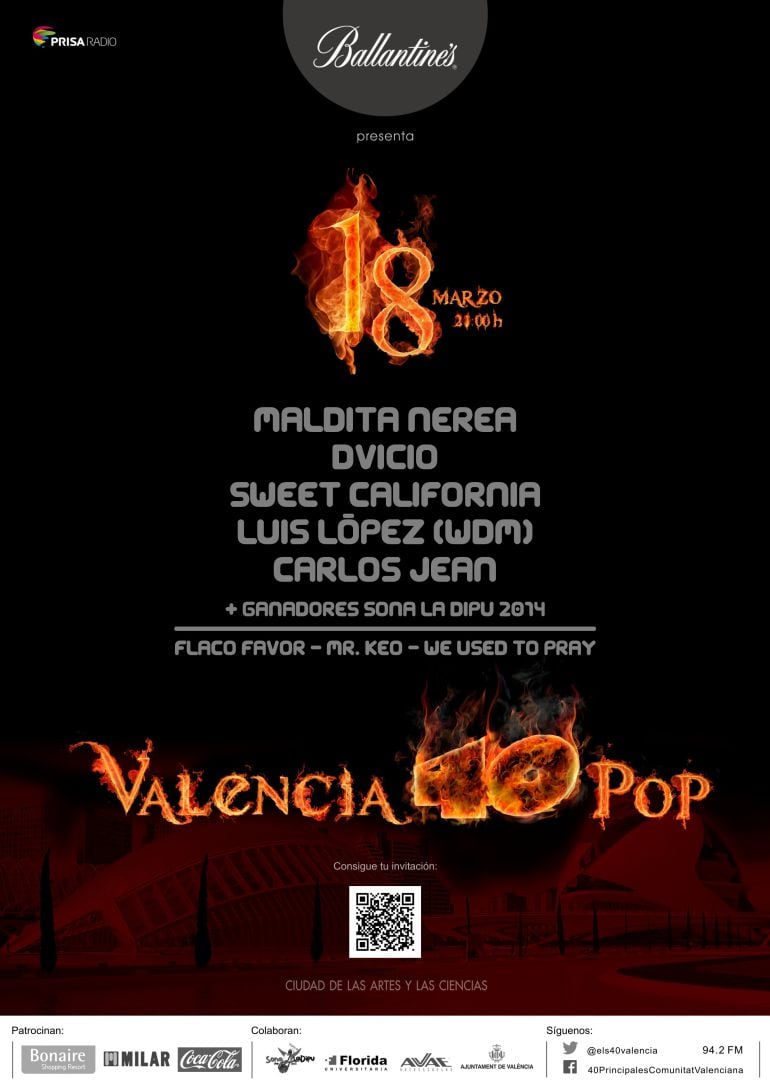 Valencia 40 Pop, el concierto de las Fallas 2015 más esperado, se ha celebrado en la Ciudad de las Artes y las Ciencias . Presentado por Xavi Martínez de Lo+40 junto a Clara Laguarda de Los 40 Principales Valencia justo antes del espectáculo pirotécnico más importante de estas fiestas: La Nit del Foc.