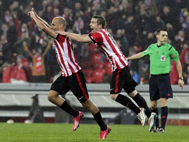 GRA393. Bilbao, 21/03/2015.- Los jugadores del Athletic de Bilbao, Mikel Rico e Iker Muniain (d), celebran el segundo gol del equipo vasco, durante el encuentro correspondiente a la vigésimo octava jornada de primera división, que disputan esta noche frente al Almeria en el estadio de San Mamés. EFE/Alfredo Aldai. / Alfredo Aldai (EFE)