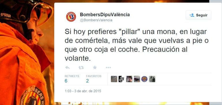 El Consorcio de Bomberos de la provincia de Valencia ha publicado un mensaje desde su cuenta oficial en Twitter para concienciar a los conductores de que no conduzcan si beben alcohol durante las fiestas de Semana Santa, y lo hace con un tono de humor que está poniendose muy de moda entre perfiles oficiales de algunas instituciones públicas.