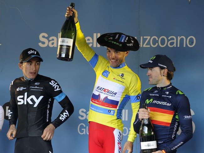 Katusha's Spanish rider Joaquim Rodriguez (C) celebrates his victory with Sky's Colombian rider Sergio Henao (L) and Movistar's Spanish rider Ion Izagirre (R) on the podium of the last stage of the Tour of the Basque Country in Aia, northern Spain, on April 11, 2015. Rodriguez won the Tour of the Basque Country ahead of Henao and Izagirre after the sixth and final stage, a 18,3 km time trial around the village of Aia. AFP PHOTO/ ANDER GILLENEA / ANDER GILLENEA (AFP)