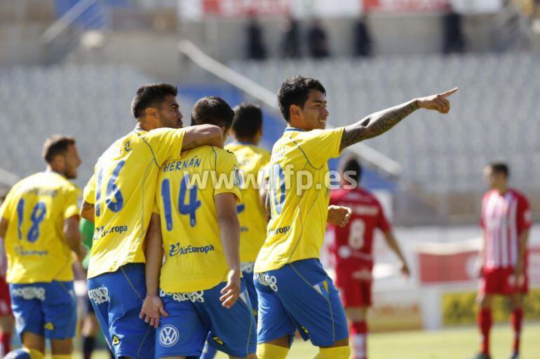 El duelo por la segunda plaza elevó a la UD Las Palmas tras un trompicado partido a los puestos de ascenso directo. Cuatro minutos le fueron suficiente a Sergio Araujo para desnudar a un organizado Girona, que pecó de manera mortal al perder un balón en zona de riesgo. David Simón asistió al argentino para que este batiera al portero del equipo catalán. Uno a cero y a verlas venir. La UD cedió la posesión del balón y el control del juego a los jugadores del Girona, pero todo este dominio apenas inquietó al portero Casto. Únicamente Matas fue el que afligió en dos ocasiones el corazón del aficionado isleño en la primera parte. No hubo más. Tan sólo una para el anecdotario, tuvo que ser atendido por sangrar . Volvió al campo con una nueva camiseta con su dorsal 8, pero el nombre de su anterior dueño, Benja, jugador cedido al Sabadell.