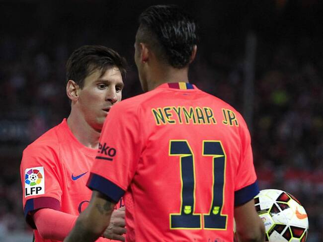GRA336 SEVILLA, 11/04/2015.- Los jugadoresc del FC Barcelona, el argentino Lionel Andrés Messi (i) y el brasileño Neymar da Silva (d), se pasan el balón antes del lanzamiento de un córner, durante el partido correspondiente a la trigésima primera jornada que disputan en el estadio Sánchez Pizjuán de Sevilla. EFE/PACO PUENTES / PACO PUENTES (EFE)