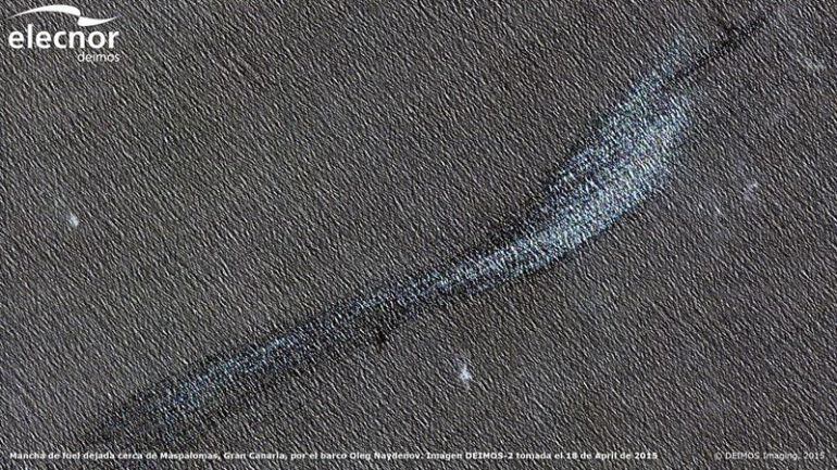 Las imágenes del satélite de observación de la Tierra muestran la evolución, entre el viernes y el sábado pasados, de la mancha de fuel vertida por el pecio, que llevaba 1.409 toneladas de combustible en sus tanques. Las fotografías muestran la mancha de hidrocarburos, que se encuentra a 92 kilómetros de la costa de Maspalomas y continúa a la deriva al suroeste. Deimos-2 permite la captura de imágenes de 12 kilómetros de ancho por 12 kilómetros de largo, con una resolución de 75 centímetros: una baldosa de 75 por 75 centímetros sería un píxel de esa imagen.