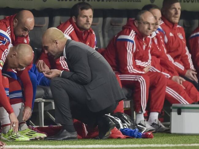 Bayern Munich's Dutch midfielder Arjen Robben (L) receives instructions from Spanish head coach Pep Guardiola before coming on during the German Cup DFB Pokal semi-final football match FC Bayern Munich v Borussia Dortmund in Munich, southern Germany, on April 28, 2015. AFP PHOTO / GUENTER SCHIFFMANN +++ RESTRICTIONS / EMBARGO x96 ACCORDING TO DFB RULES IMAGE SEQUENCES TO SIMULATE VIDEO IS NOT ALLOWED DURING MATCH TIME. MOBILE (MMS) USE IS NOT ALLOWED DURING AND FOR FURTHER TWO HOURS AFTER THE MATCH. FOR MORE INFORMATION CONTACT DFB DIRECTLY AT +49 69 67880 / GUENTER SCHIFFMANN (AFP)