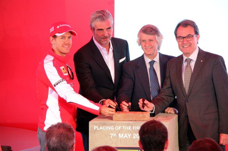 El pilot alemany de Ferrari Sebastian Vettel, quatre vegades campió del món de Fórmula 1, ha participat avui en la col·locació de la primera pedra de Ferrari Land, a PortAventura. També han estat presents el president de la Generalitat de Catalunya, Artur Mas, i màxims representants del fabricant italià.