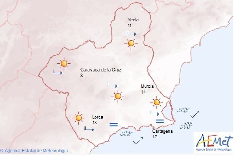 La Agencia Estatal de Meteorología anuncia para esta jornada de viernes cielos despejados, con brumas matinales en el litoral. Temperaturas mínimas con pocos cambios; máximas en ascenso, que llegará a ser localmente notable en la mitad occidental de la Región. Vientos de componente oeste.