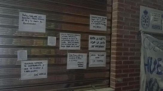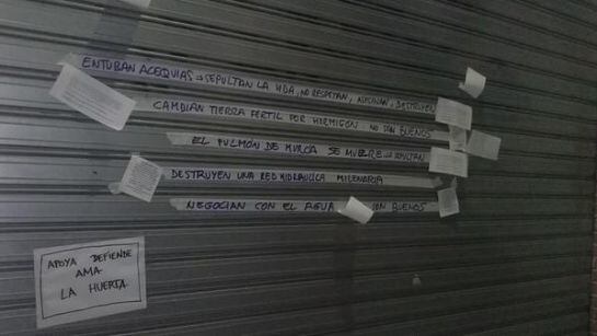 Estas son algunas imágenes de la puerta de la Junta de Hacendados de Murcia que ha aparecido plagada de pequeños carteles contra el entubamiento de acequias.