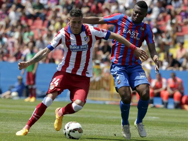 Atletico Madrid's Jose Maria Gimenez (L) and Levante's Kalu Uche fight for the ball during their Spanish first division soccer match at the Ciudad de Valencia stadium in Valencia, Spain, May 10, 2015. REUTERS/Heino Kalis / HEINO KALIS (Reuters)